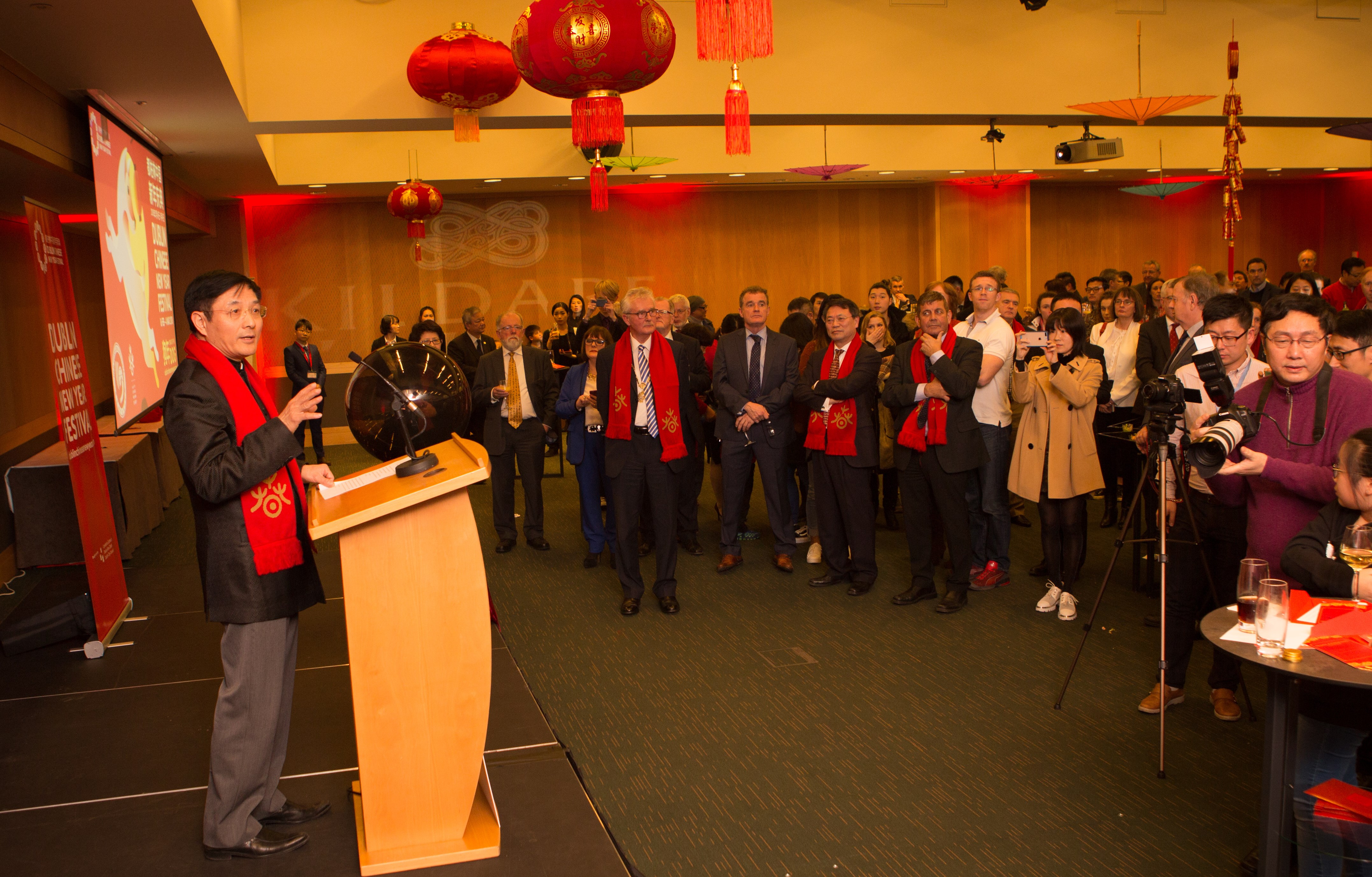 岳晓勇大使在致辞中说,今年是十九大胜利召开后的第一个春节,面对新时代新征程,中国各族人民格外振奋,新春佳节喜气盈门。春节是中国最隆重、最富有民族特色的传统佳节,象征着平安、祥和、幸福和安康,寄托着人们对新年的祝愿和期盼。由中国文化部首倡的全球“欢乐春节”活动使我们有机会与爱尔兰人民共享中华文化的优美绚丽、增强共同促进中爱友谊的信心,更努力地着眼长远,共同构建人类命运共同体。希望越来越多的爱尔兰民众与中国同胞共庆佳节,感受中华文化与世界文化交融的独特魅力。