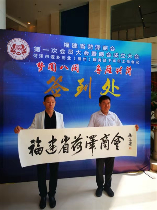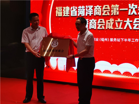 福建省工商联会员部部长郑玉明和中共菏泽市委统战部副部长、菏泽市侨办主任姜涛共同为福建省菏泽商会揭牌。